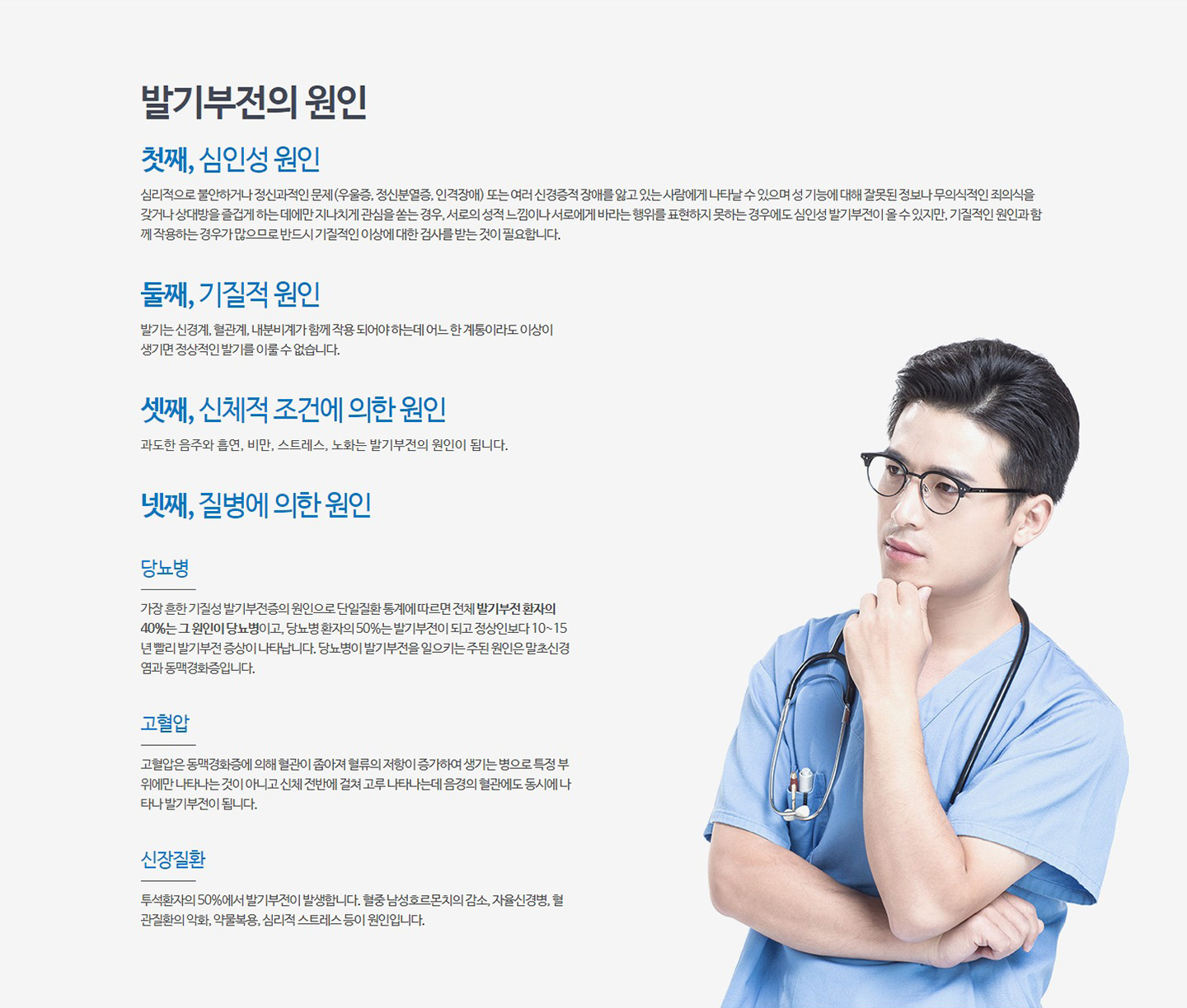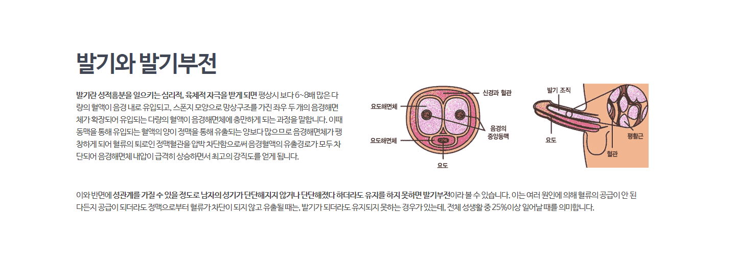중년 남성들의 가장 큰 고민으로 문제가 신체적인 경우 음경에 연결된 혈관이 좁아져 충분한 혈액이 음경을 채우지 못해 발생하는 경우가 많지만,